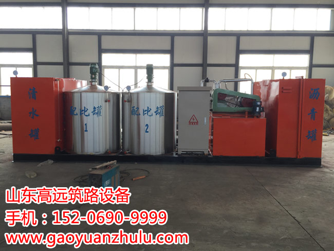 瀝青加溫罐、乳液摻配罐、水加溫罐、乳化劑反應釜(兩個)、成品罐、調速瀝青泵、調速乳液泵、乳化機(兩臺)、管道泵、攪拌泵、成品輸送泵、數控系統、大底板、管道、閥門、過濾系統等組成。