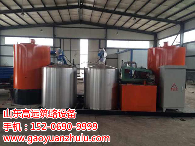 瀝青加溫罐、乳液摻配罐、水加溫罐、乳化劑反應釜(兩個)、成品罐、調速瀝青泵、調速乳液泵、乳化機(兩臺)、管道泵、攪拌泵、成品輸送泵、數控系統、大底板、管道、閥門、過濾系統等組成。