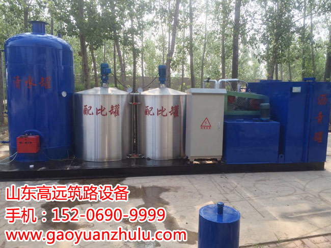 瀝青加溫罐、乳液摻配罐、水加溫罐、乳化劑反應釜(兩個)、成品罐、調速瀝青泵、調速乳液泵、乳化機(兩臺)、管道泵、攪拌泵、成品輸送泵、數控系統、大底板、管道、閥門、過濾系統等組成。